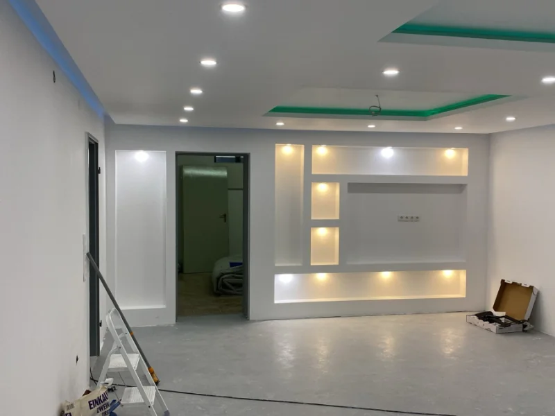 Indirektes Licht sorgt für weiche, stilvolle Atmosphäre. Wir bauen Lichtvouten, Stufen und Gipselemente, führen Kabel versteckt und bereiten alles für LED-Bänder und Spots vor – modern und wohnlich.
